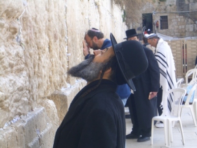 哭牆前分男女兩部份, 男士要帶上猶太小圓帽, 入口有提供, 他們會在牆前頌唸經文, 一唸到上帝的名, 就會點頭, 於是我們就會看到一直點頭的祈禱者, 最後再將寫好的禱文紙條塞進牆縫內